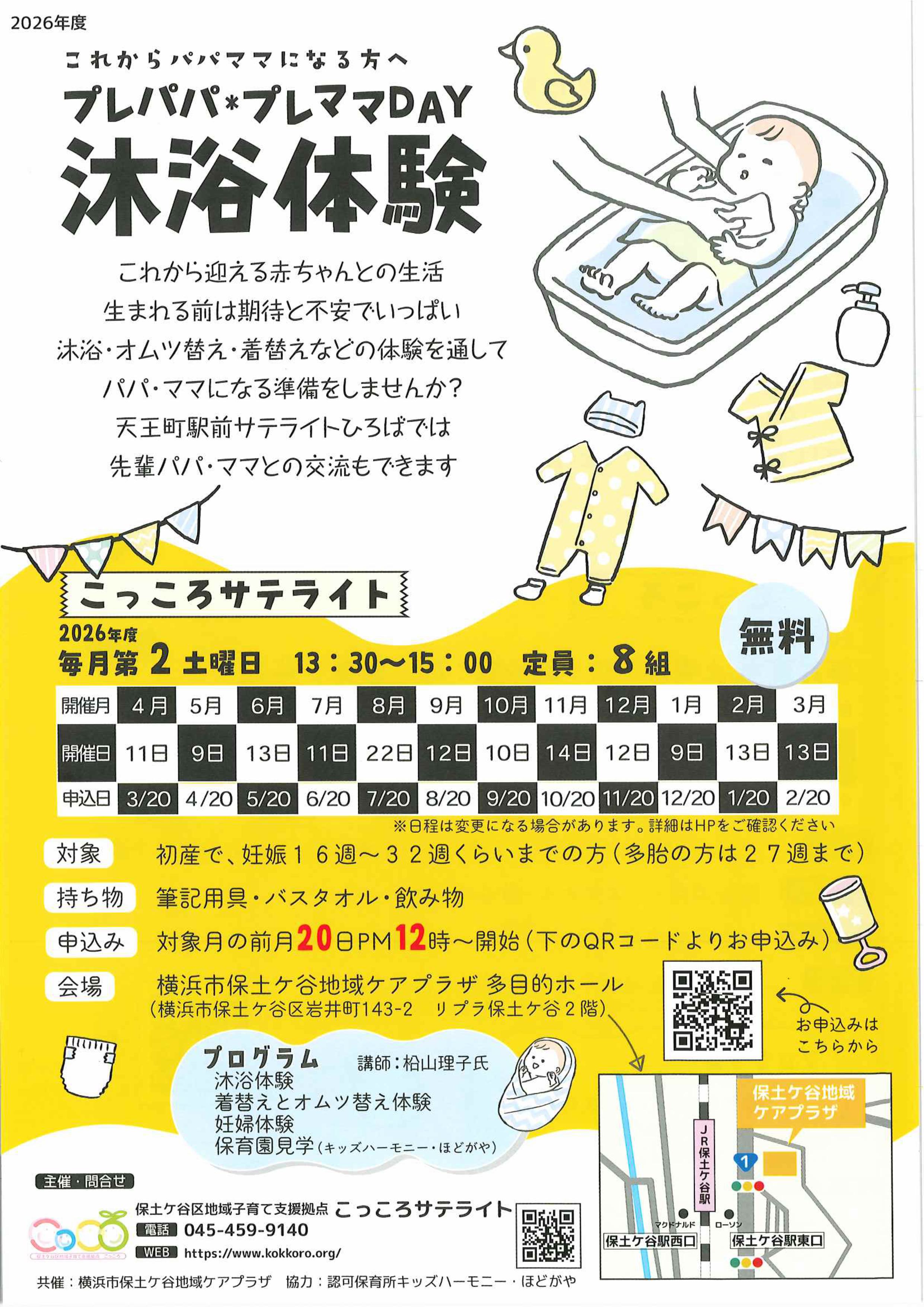 場所は保土ケ谷地域ケアプラザ、持ち物はバスタオル・筆記用具・飲み物です。