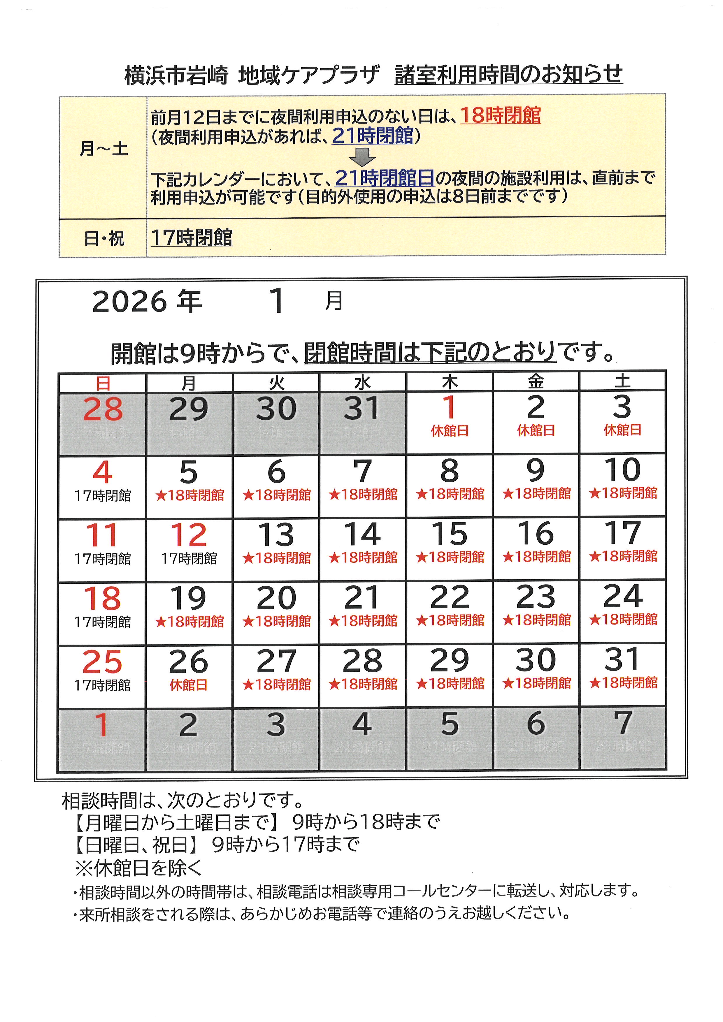 令和8年1月の閉館時間