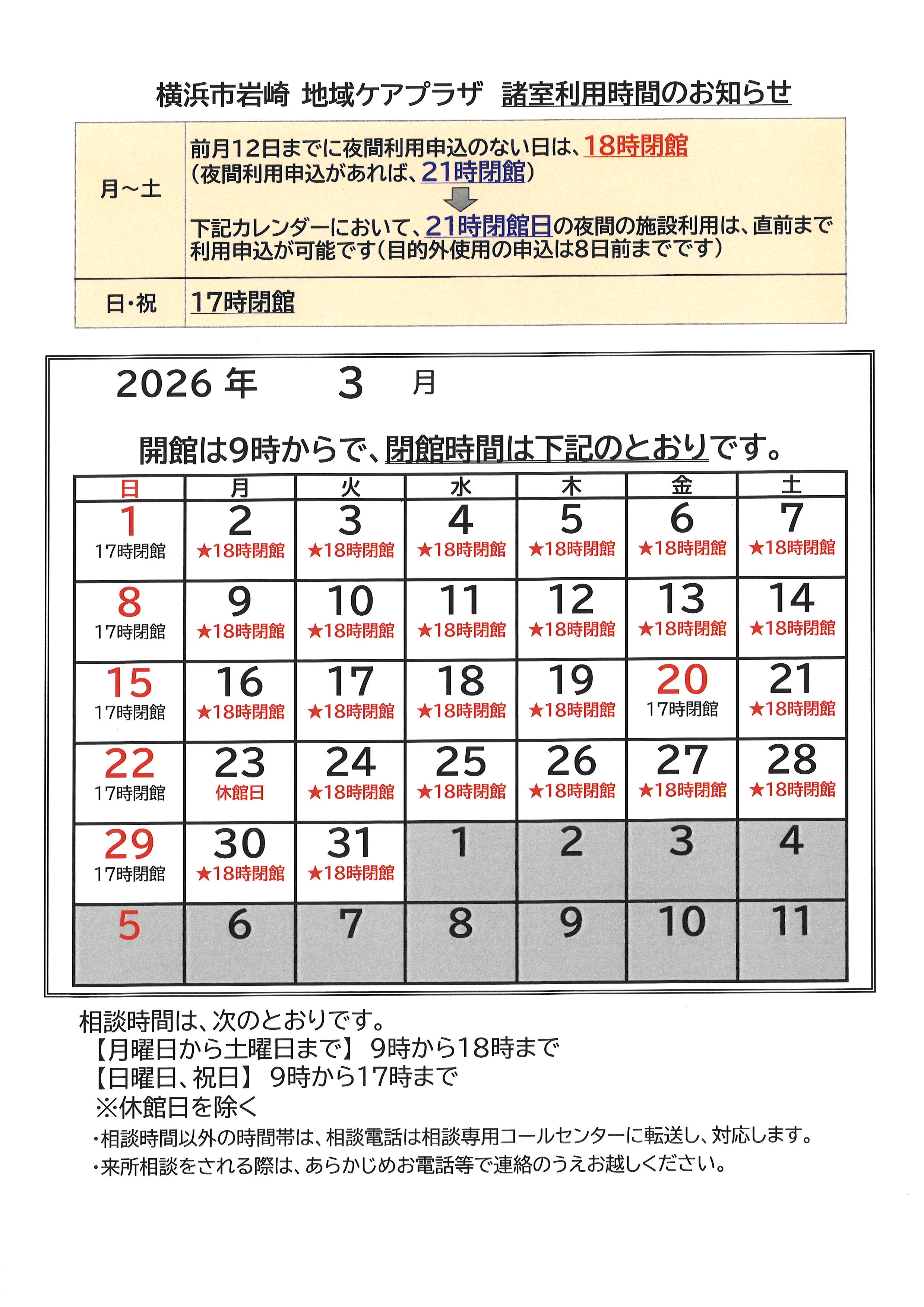 令和8年3月の閉館時間